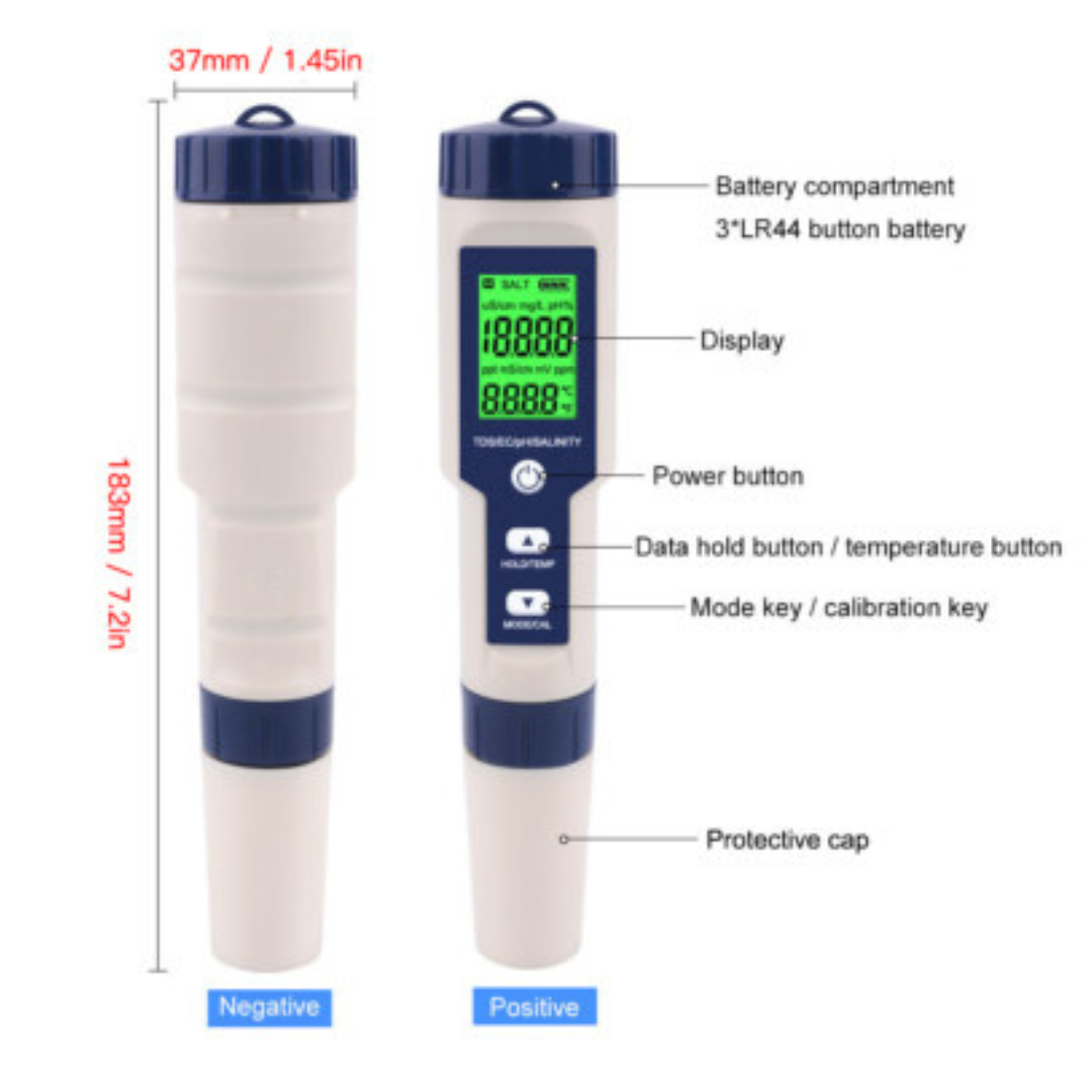| Parameters Measured | pH, TDS, EC, Salinity, Temperature (5-in-1) |