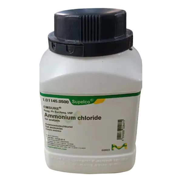 Ammonium Chloride (NH₄Cl) is a high-purity laboratory chemical supplied by Merck, Germany, worldwide for research and industrial applications. It appears as a white crystalline salt, highly soluble in water, and widely used in analytical chemistry, pharmaceuticals, industry, and general laboratory experiments.
