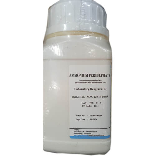 Ammonium Persulfate (APS), supplied by SmartLab Indonesia, is a high-purity laboratory and industrial chemical widely used as a strong oxidizing agent. It comes in a 500 g pack, making it suitable for laboratories, research institutions, and industrial applications. Known for its stability and powerful oxidizing properties, Ammonium Persulfate is essential in polymerization, etching, cleaning, and analytical chemistry.