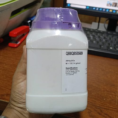 Ammonium sulfate (Ammonium Sulphate Lab Grade); (NH₄)₂SO₄ is an inorganic salt with several commercial and lab uses. The most common use is as a soil fertilizer and analysis. It contains 21% nitrogen and 24% sulfur. Click for SDS. Ammonium Sulphate is an inorganic salt with the formula (NH4)2SO4(NH_4)_2SO_4. It appears as a white crystalline solid. People commonly use it as a fertilizer in agriculture. Farmers apply it to provide nitrogen and sulfur to crops. In addition to agriculture, industries use Ammonium Sulfate in various applications. Manufacturers add it to food products as a food additive. It helps in protein stabilization and improves the texture of certain foods. Researchers also use Ammonium Sulphate in laboratories. They utilize it for protein purification through a process called salting out. This method exploits the solubility differences of proteins at various salt concentrations. Moreover, ammonium sulphate plays a role in water treatment. Water treatment facilities use it to remove impurities and enhance water quality. Ammonium Sulfate 500 gm Merck India and Gong