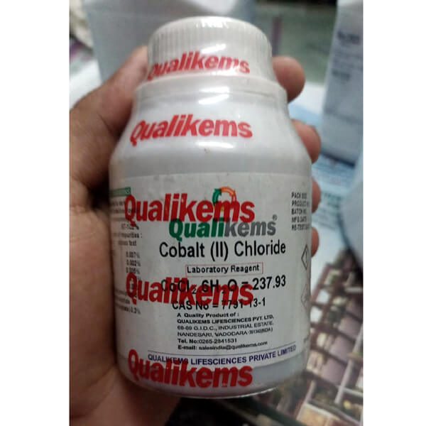 Cobalt (II) Chloride (CoCl₂·6H₂O) by Qualikems Lifesciences Pvt. Ltd. (India) is a high-purity laboratory reagent (LR Grade) used for chemical analysis, synthesis, indicator preparation, and research applications.