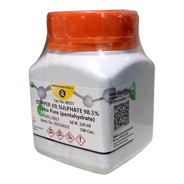 Buy Copper (II) Sulphate Pentahydrate 500g – Extra Pure (CuSO₄·5H₂O) from Research-Lab India. High-purity analytical reagent ideal for laboratory, industrial, and agricultural use. ISO-certified quality for accurate research and experiments.