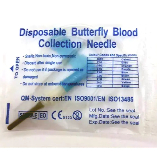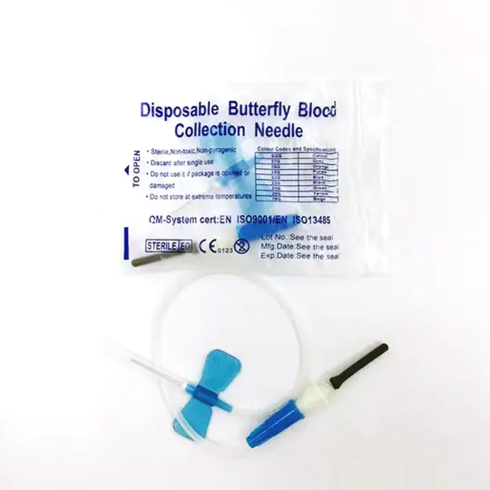 Ensure safe, comfortable, and efficient blood draws with our Disposable Butterfly Blood Collection Needle. Designed for single-use, this needle features a flexible “butterfly wing” design that allows for precise placement and improved control during venipuncture, making it ideal for use in hospitals, clinics, and diagnostic labs.