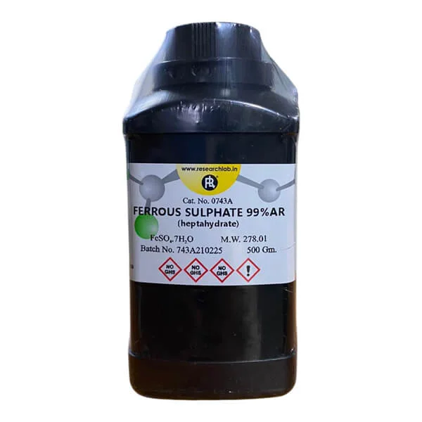 Ferrous Sulphate Heptahydrate AR Grade (FeSO₄·7H₂O), manufactured by Research Lab Fine Chem India (RL India), is a high-purity analytical reagent widely used in analytical chemistry, water testing, and laboratory experiments. Known for its reliability, stability, and purity, it provides precise results in both qualitative and quantitative analyses.