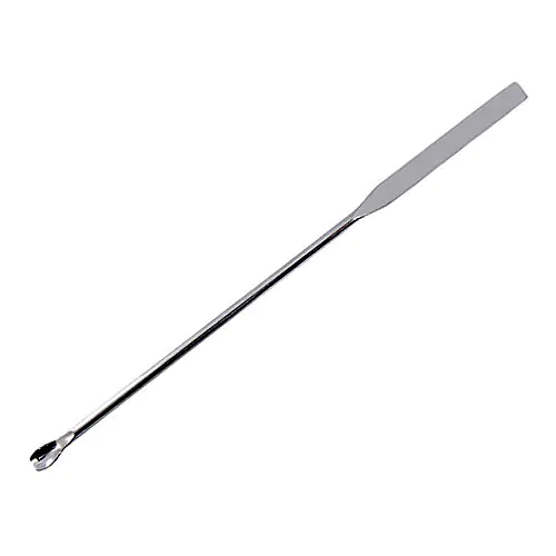 Stainless Steel Lab Spatula 200mm. No corner is out of reach, and no materials are lost. Handles crystals, powders, granular and solid substances, as well as thick liquids or delicate substances. Made from stainless steel, it will not bend. Has both the spoon end and the spatula end.