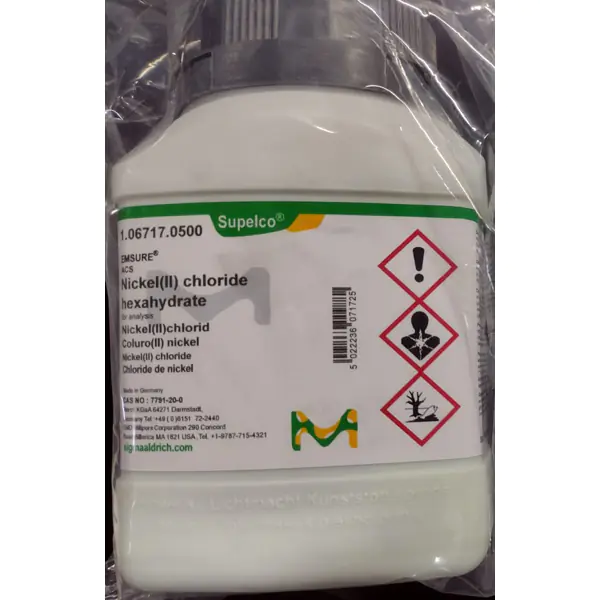 Nickel Chloride Hexahydrate (NiCl₂·6H₂O) is a green crystalline solid commonly used in electroplating, as a catalyst, and to prepare other nickel compounds. The 500g Merck version provides a high-purity reagent suitable for scientific and research applications. Scientists use it in the synthesis of nickel-based catalysts and various chemical processes. Due to its toxicity and corrosive nature, it requires careful handling. Click to Know More. The real picture may have some changes from the displayed picture.