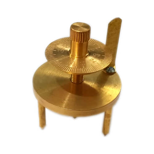 Indian Spherometer Double Disc All Brass Steel Legs for Physics Laboratory. This Spherometer comprises a circular metal table 50 mm in diameter with three accurately positioned painted steel legs and ordinary steel screw thread working in long adjustable brass bearings. A circular scale is carried on the thread and a scale on the table, enabling the user to take accurate micrometer-type readings. It is mostly used in physics laboratories in Bangladeshi schools & colleges. Labzo is the supplier and wholesaler of Single Disc and Double Disc Spherometers.