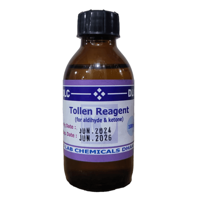 Tollens’ reagent is prepared by adding ammonia (NH₃) to a dilute solution of silver nitrate (AgNO₃). The reaction between ammonia and silver nitrate results in the formation of a colorless complex ion, [Ag(NH₃)₂]⁺, which is soluble in water:Reactions of Tollen Reagent 100mL for Aldihyde and Ketone